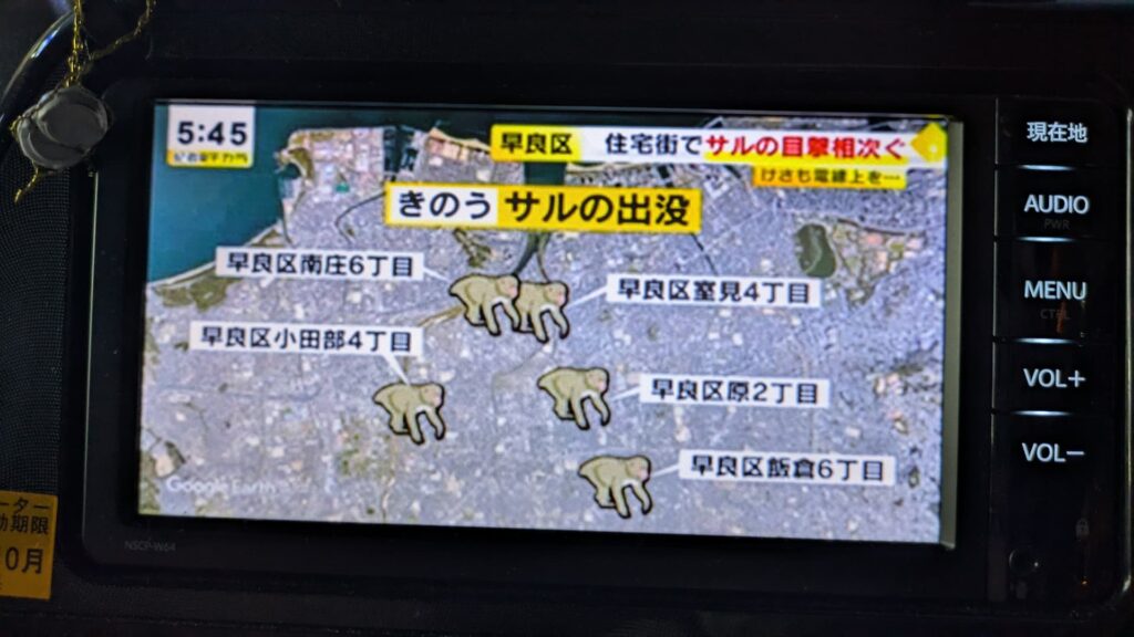 休憩中にTV見たりもできちゃいます。古いナビなので画像はお察しですが。写真はこの間のニュース番組で早良区にサルが出た時のもの。字はそれなりに読めます。