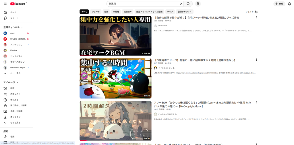Youtubeで作業用BGMを調べると、Jazzやボサノバ、ゲームBGMの耐久などなどたくさんのジャンルが出てきます。