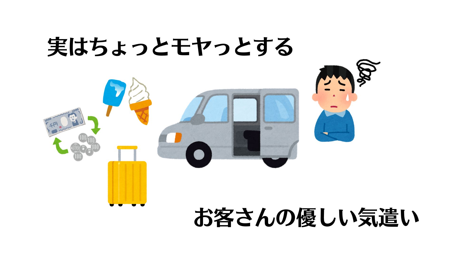 チップの現物支給とでも言いましょうか、おやつだったりお茶だったりをもらうことって思った以上にあるんです。多くは道中でコンビニに寄った時。ついでにお茶や栄養ドリンクを買ってきてもらえることがあります。そういう時はありがたくいただきます。