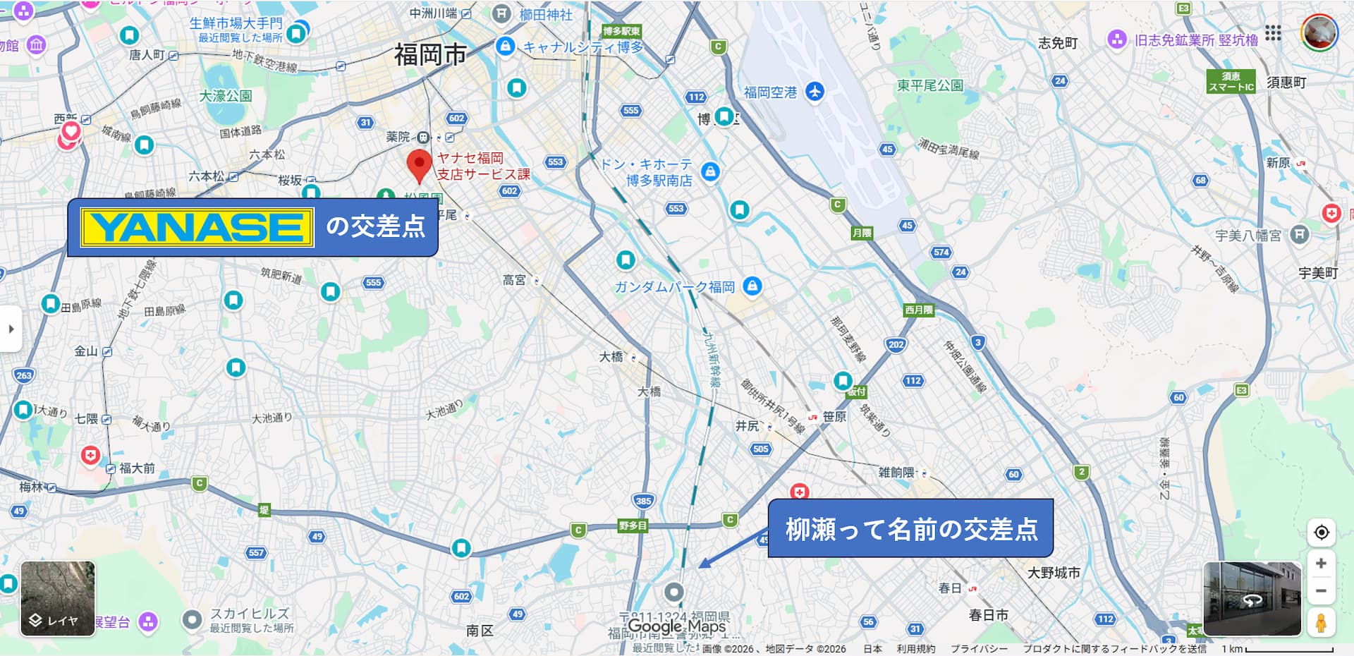 距離にするとこれくらい違います。中央区にあるYANASEがある交差点と、南区の柳瀬交差点。